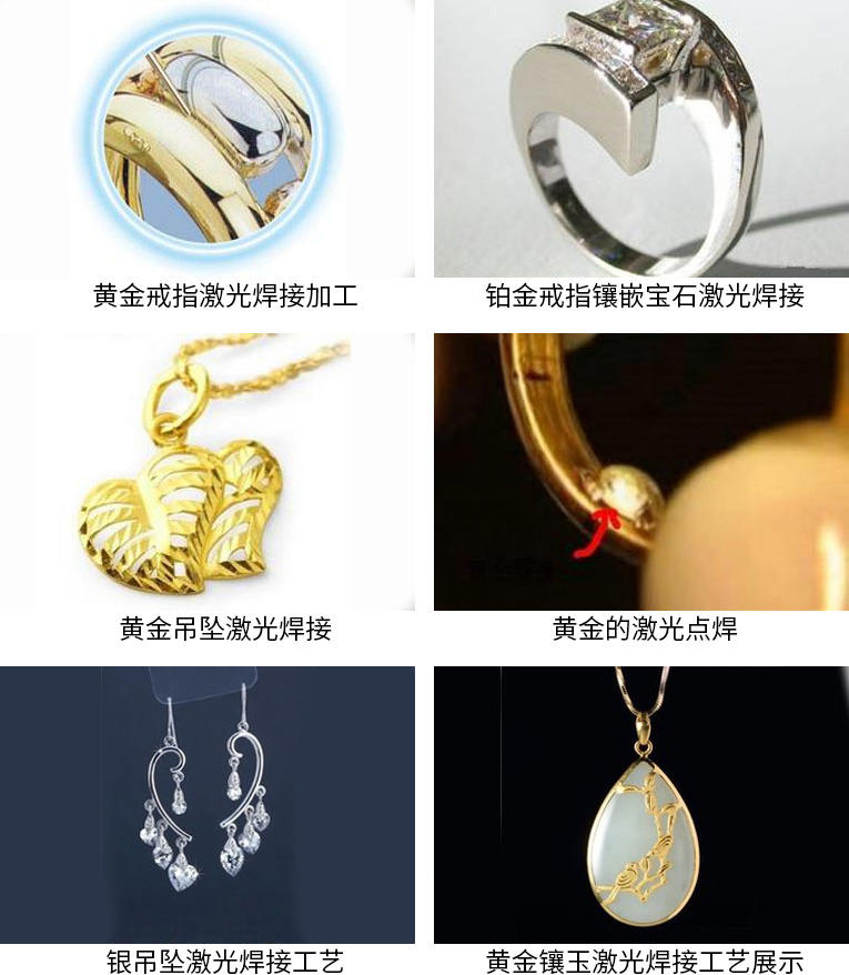 8、可激光焊接各種金屬材質:金,銀,鉑金,銅,鈦,不銹鋼等各種金屬材料。包括:戒指,耳環,手鏈,項鏈,領帶夾,袖口等珠寶首飾,金屬飾品的激光焊接。